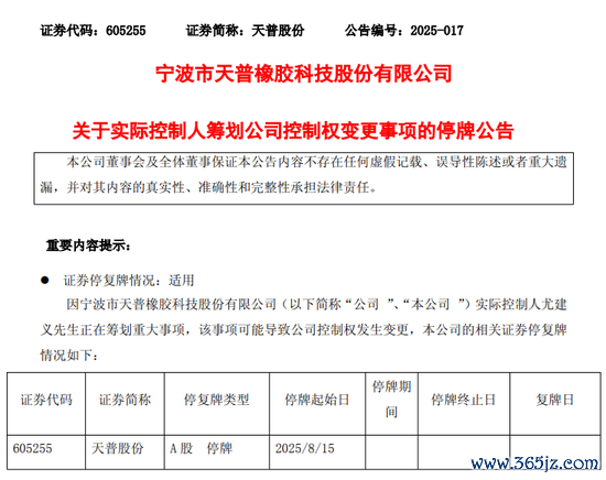 天普股份(605255)8月14日晚间公告,公司近日收到骨子鸿沟东说念主尤建义先生奉告,其正在计算要紧事项,该事项可能导致公司鸿沟权发生变更。