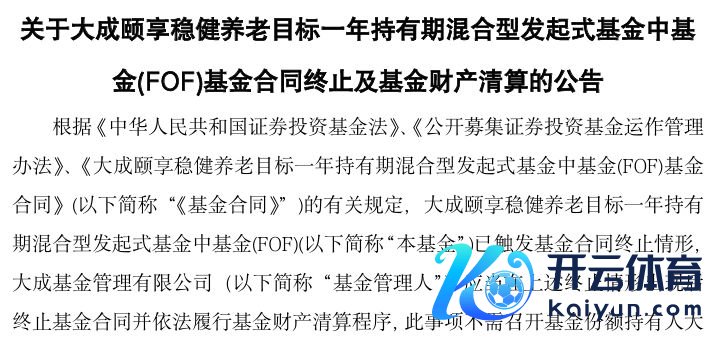 近日,大成基金公告称,大成颐享矜重养老见地一年抓有夹杂发起式(FOF)已触发基金公约停止情形,基金临了一个运作日为2025年9月1日,自2025年9月2日(临了运作日的下一日)起插足计帐标准。